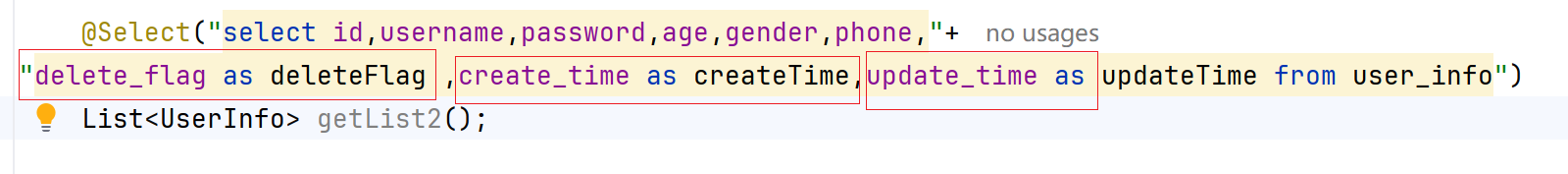 我们发现当使用as的时候,返回的视图的字段是deleteFlag,这说明我们这样写,返回的视图可以和java的实体类映射上啊,这问题不久解决了嘛。