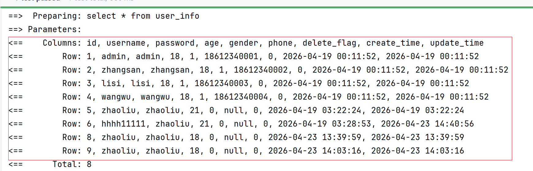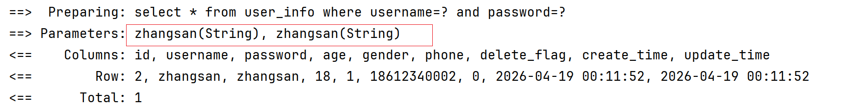 测试成功,返回zhangsan数据行!
