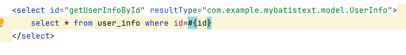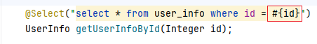 正常,我们通过#{id} 来给要传入的变量id进行占位,虽然占位多少有些勉强,甚至不能这么讲,但等到下面合适的时候,我再跟大家聊聊它背后是咋做的吧,先这样理解。