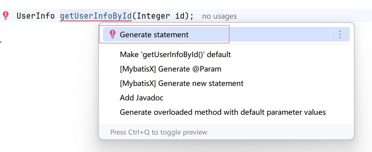 效果:装了这个插件之后,我们就可以通过点击左边的小鸟图标,来对XML文件和接口之间进行跳转操作了,而且这个插件还会帮我们检查XML文件是否有错误啥的,反正大家就装上即可,非常好用。