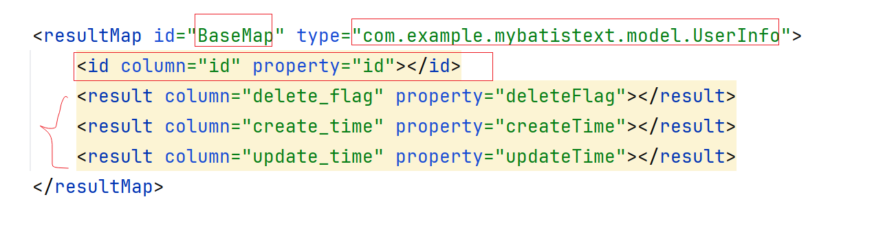 简单介绍一下这个resultMap,id就是你给这个模板起的名字,type就是要映射的类型,