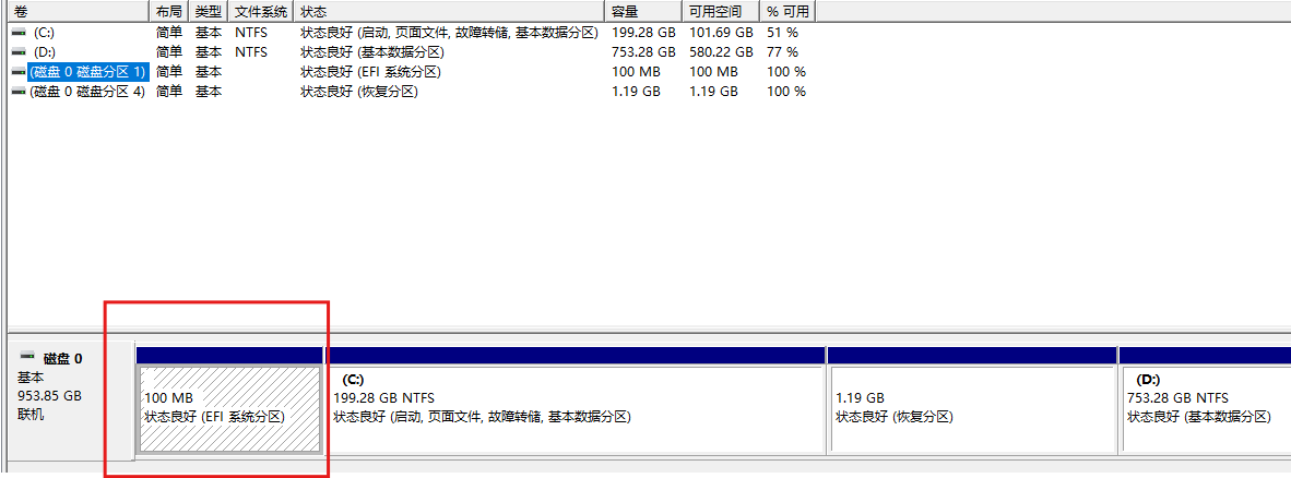 BCD文件存放在EFI系统分区(ESP)中。我们无法在Windows资源管理器中看到它,因为它位于一个隐藏的、未分配盘符的特殊分区里(如下图):