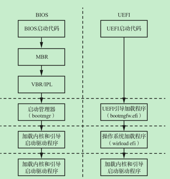 这里不多讨论两种固件程序的实现细节和区别,感兴趣的读者可以阅读《x86汇编:从实模式到保护模式》与《Rootkit和Bootkit:现代恶意软件逆向分析和下一代威胁》(以下简称《R&B》)。现在大多使用UEFI。