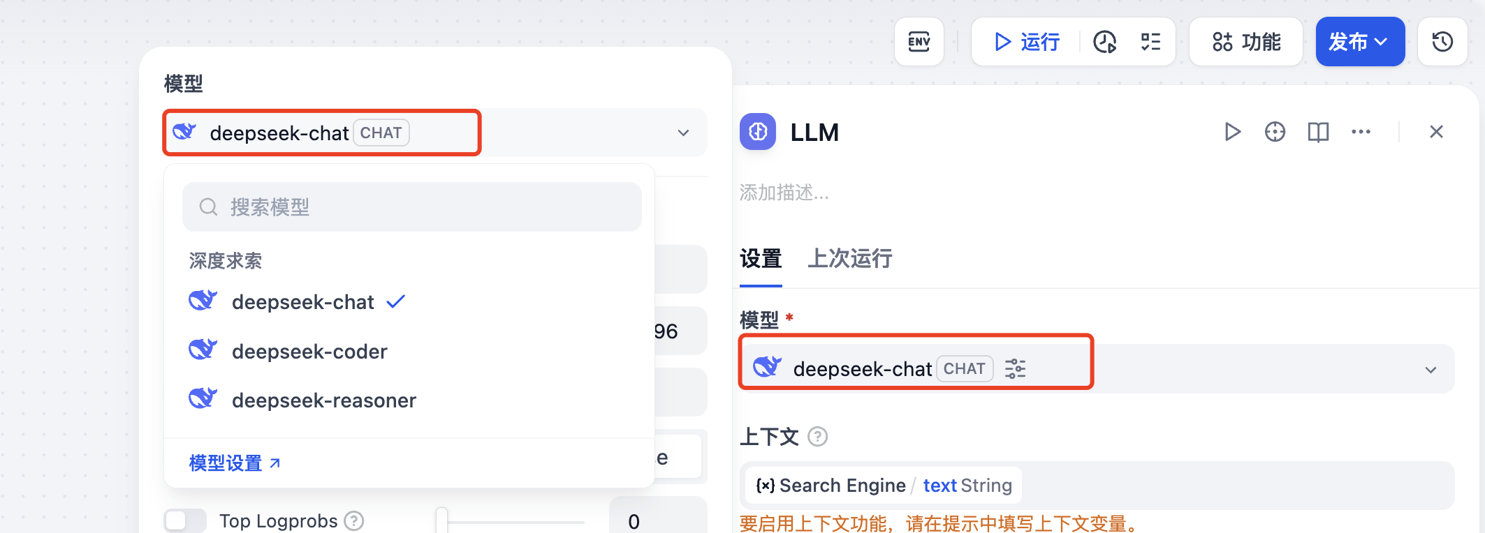 在MCP节点之后,设置LLM节点,这里模型选择"deepseek-chat",如果没有设置模型的API KEY的话需要进行授权