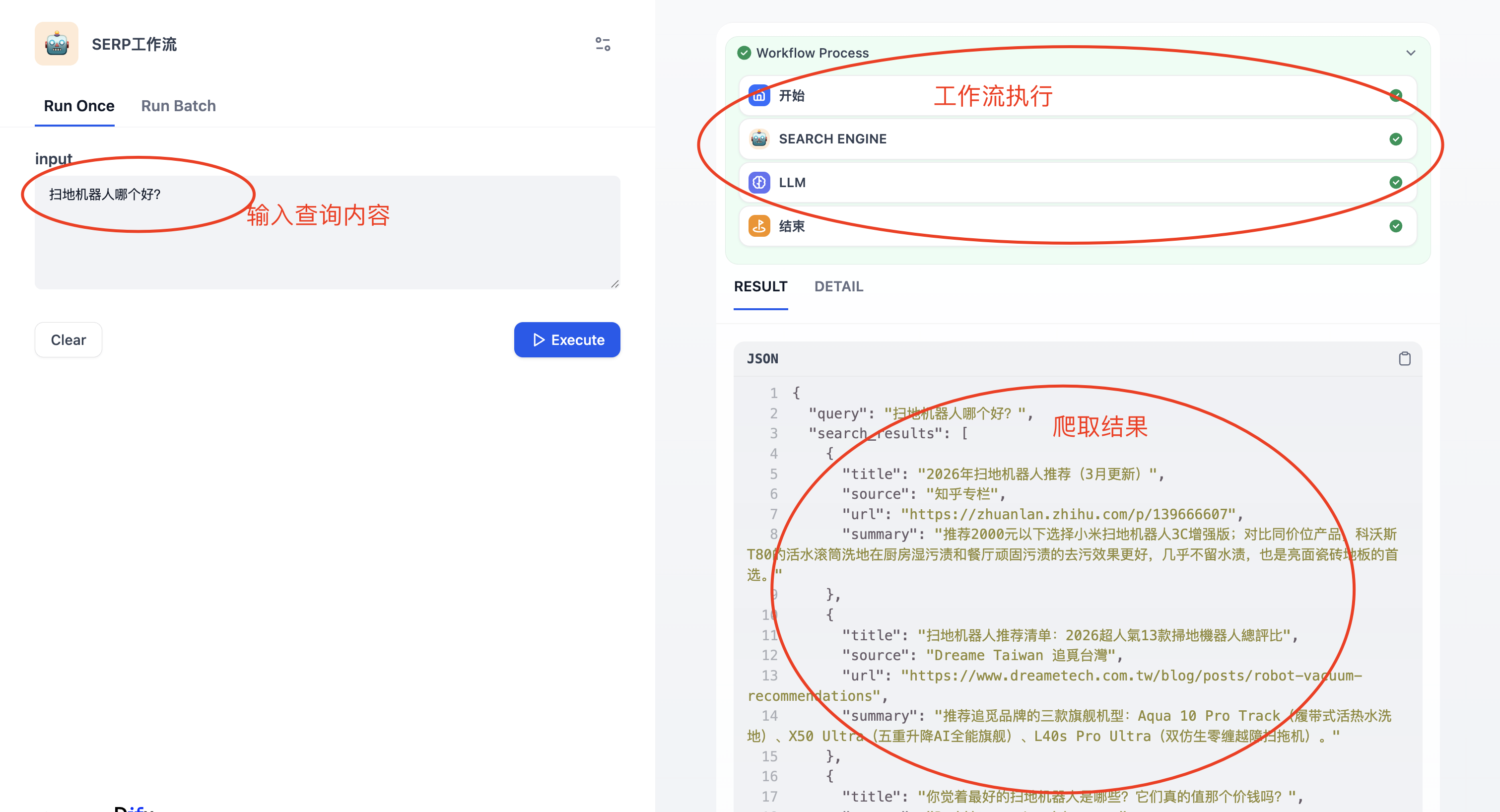 随后我们执行工作流,输入查询的内容:扫地机器人哪个好?工作流开始执行,随后输出爬取结果