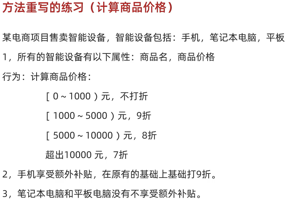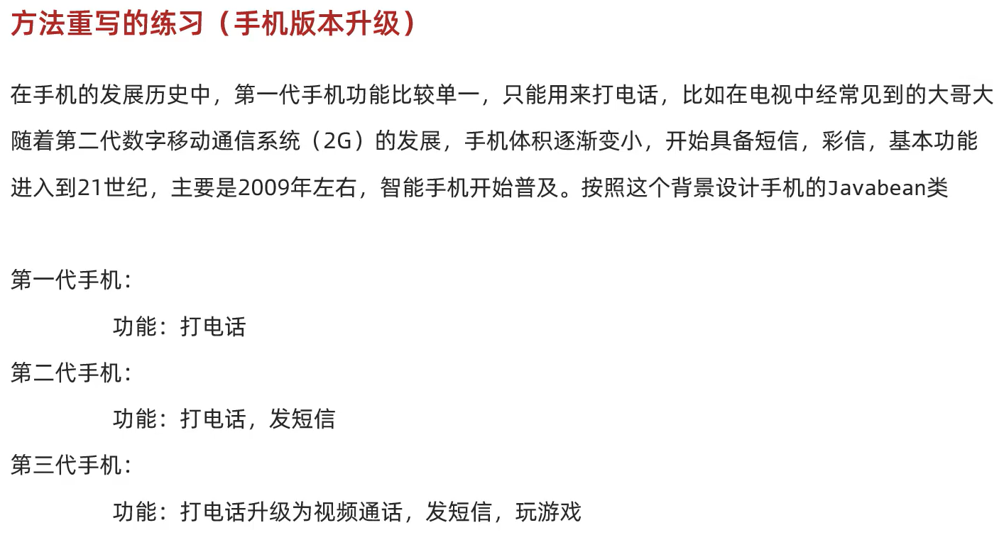 - 如果父类里面的代码,我一行都不想用,此时把子类中的方法体重新完整写一遍即可(练习一)