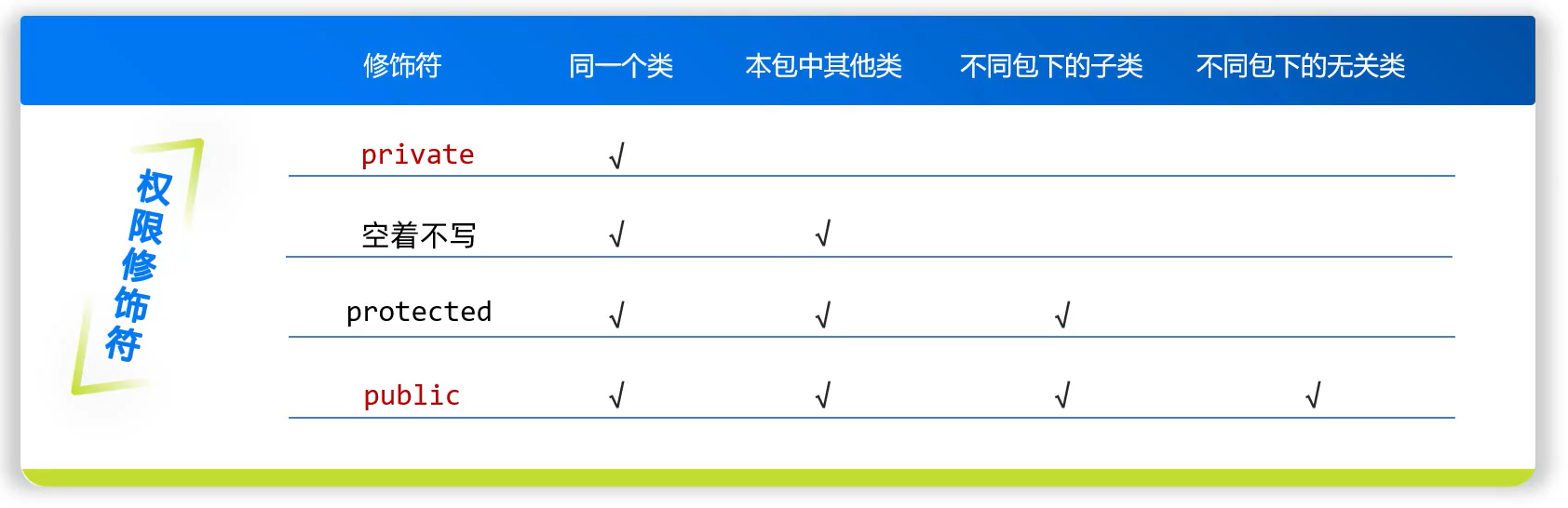 - 权限修饰符: 其实就是Java中的关键字, 用来控制一个成员被访问的范围