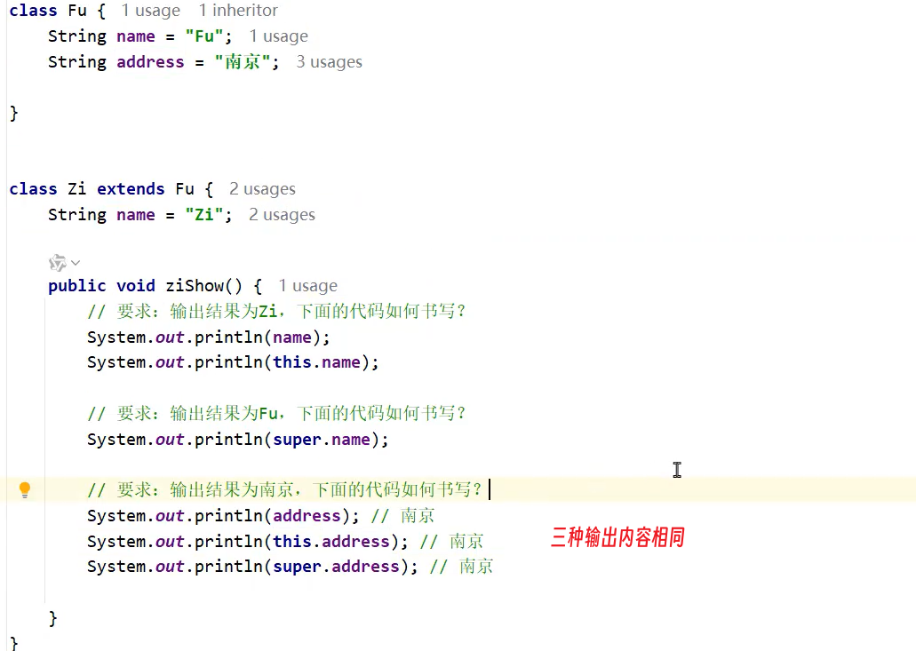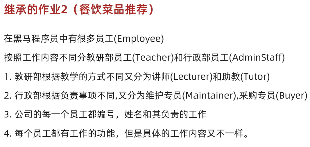 - 如果父类里面的代码我还想用,此时我只是在父类的基础上再加其他的逻辑此时可以先通过super关键字调用父类的方法得到一个结果,再对这个结果进行操作即可(练习二)