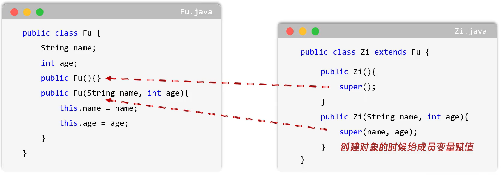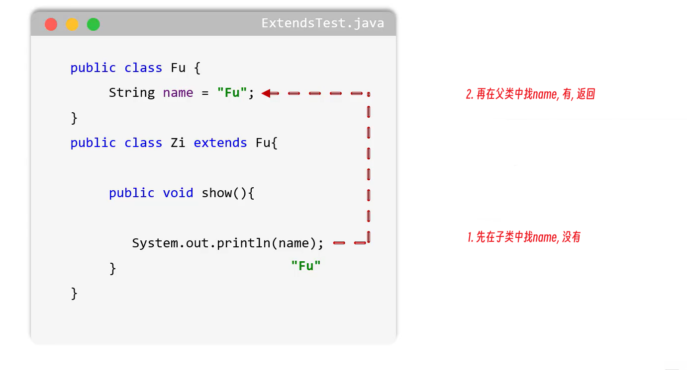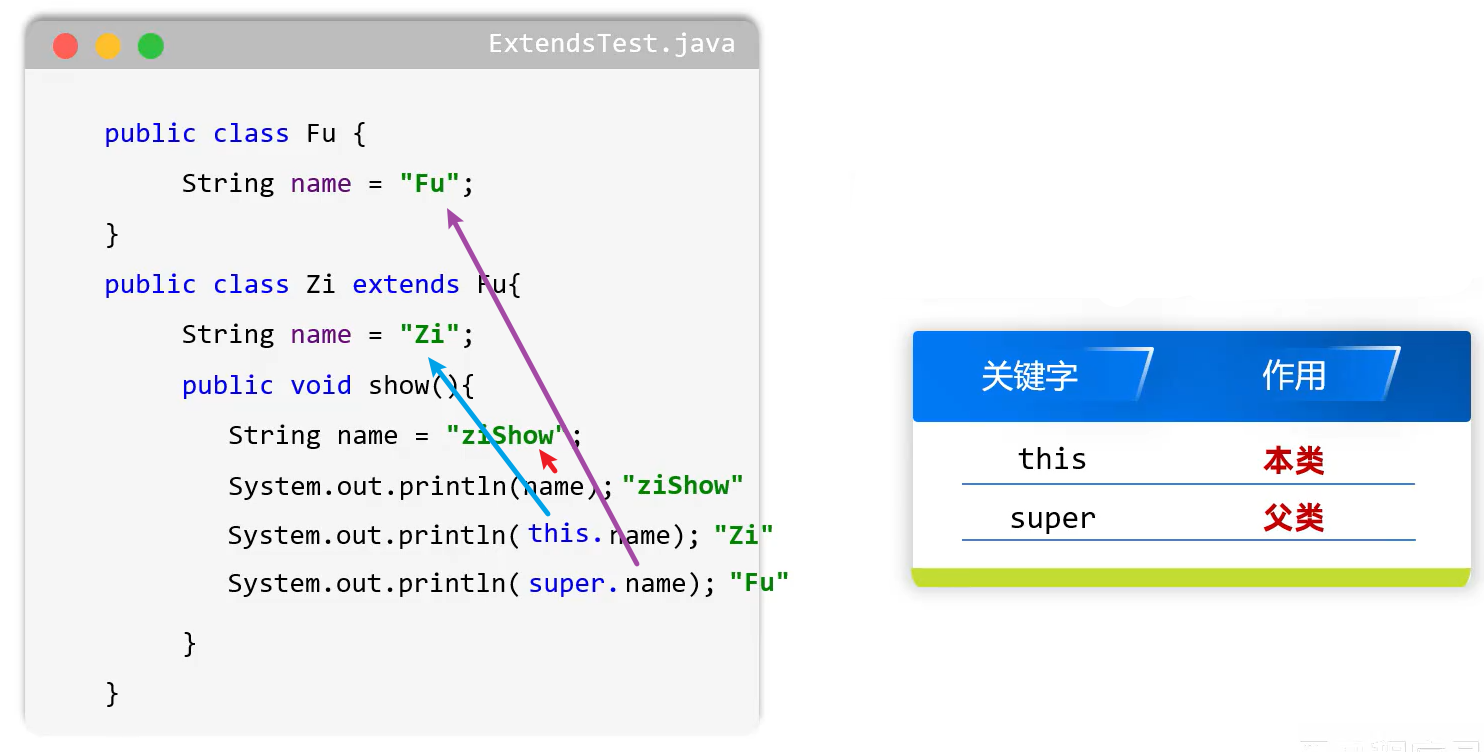 - 继承是类和类之间的父子关系, Java中提供关键字