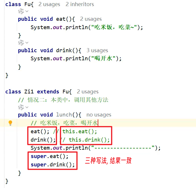 书写规则: 把多个子类中共性的成员方法抽取到父类中(抽取共性)