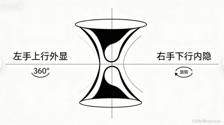 它是以上方为极点的漏斗结构,从右下向左上旋转 360° 抵达顶点后,直接翻转到对面,切换为右手构型,向右下方延伸,最终回转到起点完成闭合。整体呈现出左手上行、右手下行,左外右内的上下同体形态。