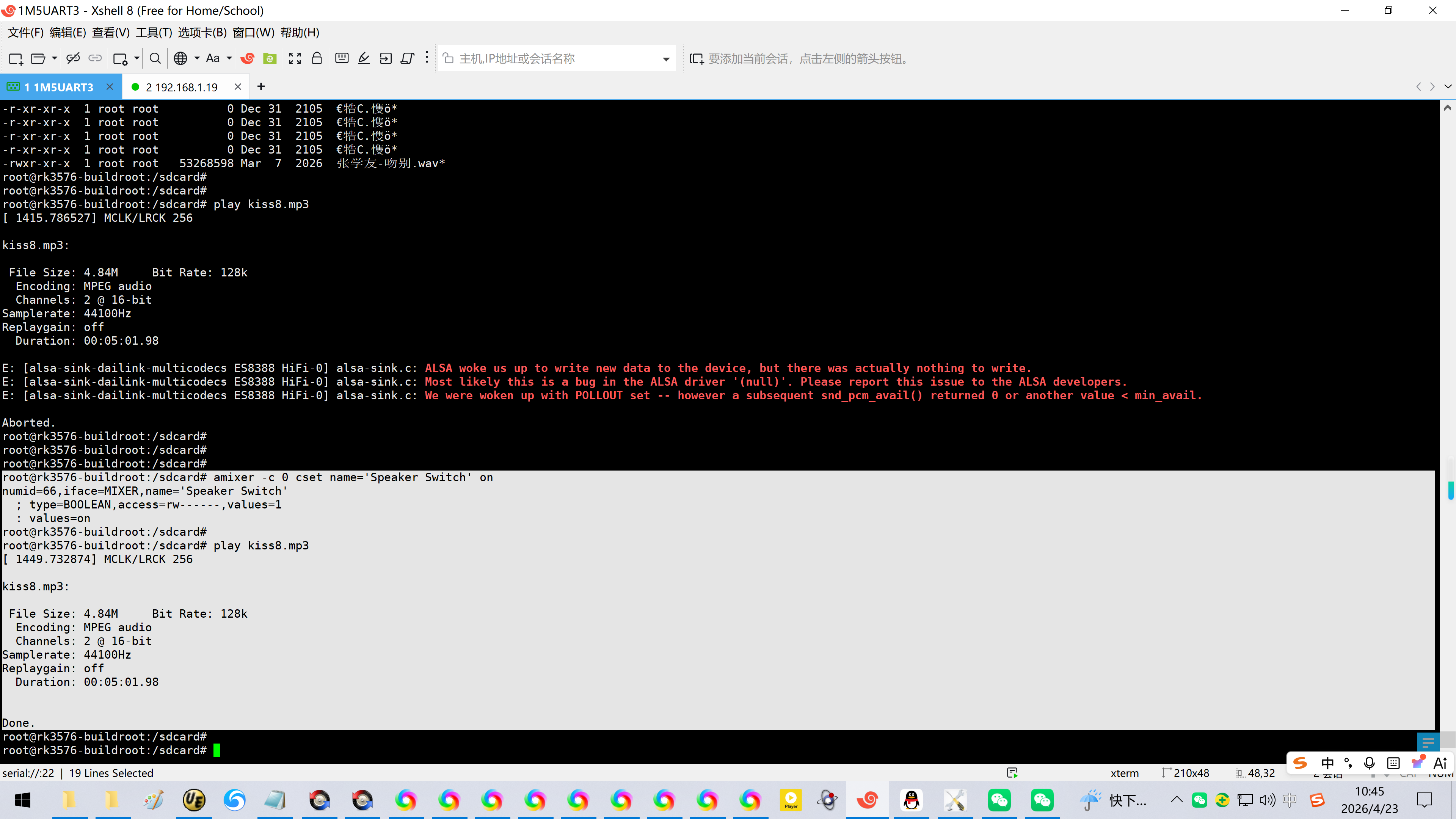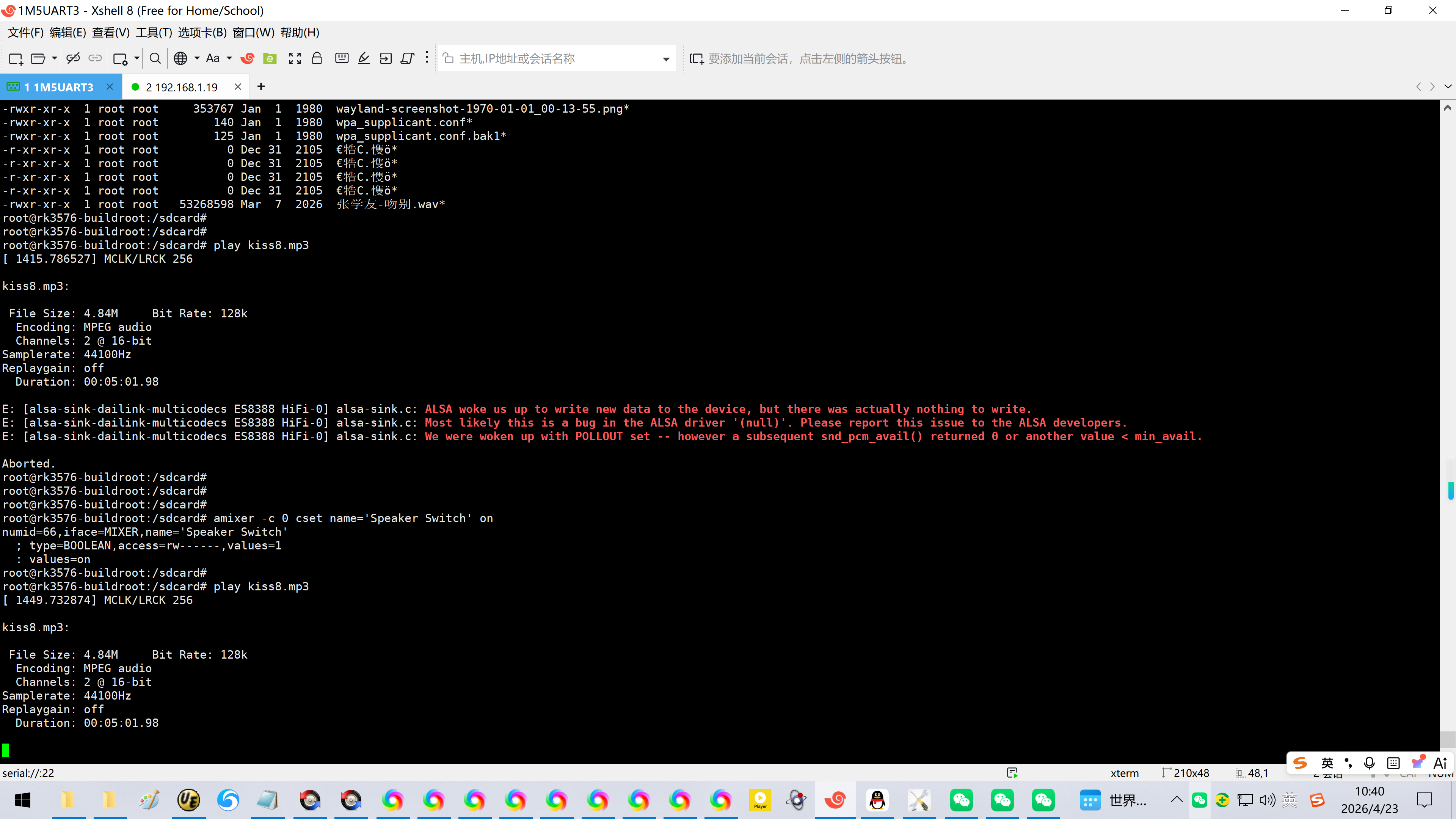 1415.786527\] MCLK/LRCK 256 kiss8.mp3: File Size: 4.84M Bit Rate: 128k Encoding: MPEG audio Channels: 2 @ 16-bit Samplerate: 44100Hz Replaygain: off Duration: 00:05:01.98 E: \[alsa-sink-dailink-multicodecs ES8388 HiFi-0\] alsa-sink.c: ALSA woke us up to write new data to the device, but there was actually nothing to write. E: \[alsa-sink-dailink-multicodecs ES8388 HiFi-0\] alsa-sink.c: Most likely this is a bug in the ALSA driver '(null)'. Please report this issue to the ALSA developers. E: \[alsa-sink-dailink-multicodecs ES8388 HiFi-0\] alsa-sink.c: We were woken up with POLLOUT set -- however a subsequent snd_pcm_avail() returned 0 or another value \< min_avail. Aborted. root@rk3576-buildroot:/sdcard# root@rk3576-buildroot:/sdcard# root@rk3576-buildroot:/sdcard# root@rk3576-buildroot:/sdcard# amixer -c 0 cset name='Speaker Switch' on numid=66,iface=MIXER,name='Speaker Switch' ; type=BOOLEAN,access=rw------,values=1 : values=on root@rk3576-buildroot:/sdcard# root@rk3576-buildroot:/sdcard# play kiss8.mp3 \[ 1449.732874\] MCLK/LRCK 256 kiss8.mp3: File Size: 4.84M Bit Rate: 128k Encoding: MPEG audio Channels: 2 @ 16-bit Samplerate: 44100Hz Replaygain: off Duration: 00:05:01.98 Done. root@rk3576-buildroot:/sdcard# root@rk3576-buildroot:/sdcard# root@rk3576-buildroot:/sdcard# root@rk3576-buildroot:/sdcard# root@rk3576-buildroot:/sdcard# play kiss8.wav \[ 2096.503936\] MCLK/LRCK 256 kiss8.wav: File Size: 53.3M Bit Rate: 1.41M Encoding: Signed PCM Channels: 2 @ 16-bit Samplerate: 44100Hz Replaygain: off Duration: 00:05:01.98 Done. root@rk3576-buildroot:/sdcard#   完整LOG: \[BEGIN\] 2026/4/23 10:15:18 \[ 5.861895\] \[dhd\] wifi_platform_set_power = 1, sleep done: 200 msec \[ 5.861964\] \[dhd\] sdio_sw_reset: call mmc_hw_reset \[ 6.081801\] mmc_host mmc2: Bus speed (slot 0) = 400000Hz (slot req 400000Hz, actual 400000HZ div = 0) \[ 6.185338\] mmc_host mmc2: Bus speed (slot 0) = 50000000Hz (slot req 50000000Hz, actual 50000000HZ div = 0) \[ 6.185518\] \[dhd\] sdioh_start: set sd_f2_blocksize 256 \[ 6.185855\] \[dhd\] dhd_bus_devreset: == Power ON == \[ 6.186148\] \[dhd\] F1 signature read @0x18000000=0x15294345 \[ 6.190373\] \[dhd\] F1 signature OK, socitype:0x1 chip:0x4345 rev:0x9 pkg:0x2 \[ 6.191359\] \[dhd\] DHD: dongle ram size is set to 819200(orig 819200) at 0x198000 \[ 6.191575\] \[dhd\] dhd_bus_devreset: making DHD_BUS_DOWN \[ 6.191648\] \[dhd\] dhdsdio_probe_init: making DHD_BUS_DOWN \[ 6.191851\] \[dhd\] dhd_conf_set_path_params : Final fw_path=/vendor/etc/firmware/fw_bcm43456c5_ag.bin \[ 6.191884\] \[dhd\] dhd_conf_set_path_params : Final nv_path=/vendor/etc/firmware/nvram_ap6256.txt \[ 6.191911\] \[dhd\] dhd_conf_set_path_params : Final clm_path=/vendor/etc/firmware/clm_bcm43456c5_ag.blob \[ 6.191936\] \[dhd\] dhd_conf_set_path_params : Final conf_path=/vendor/etc/firmware/config.txt \[ 6.198758\] \[dhd\] dhd_os_open_image1: /vendor/etc/firmware/config.txt (240 bytes) open success \[ 6.199549\] \[dhd\] dhd_conf_read_pm_params : PM = 0 \[ 6.199600\] \[dhd\] dhd_conf_read_pm_params : pm_in_suspend = 2 \[ 6.199641\] \[dhd\] dhd_conf_read_others : keep_alive_period = 120000 \[ 6.199677\] \[dhd\] dhd_conf_read_others : garp = 1 \[ 6.199712\] \[dhd\] dhd_conf_read_pm_params : suspend_bcn_li_dtim = 10 \[ 6.199756\] \[dhd\] dhd_conf_read_others : wl_preinit = pm2_sleep_ret=20 \[ 6.199798\] \[dhd\] dhd_conf_read_pkt_filter : pkt_filter_del id = 100 102 103 104 105 107 \[ 6.199942\] \[dhd\] dhd_conf_read_pkt_filter : pkt_filter_add\[0\]\[\] = 142 0 0 77 0xffffffffffffffffffffffffffffff 0x2F6465766963652F77616B6575702F \[ 6.200913\] \[dhd\] dhd_os_open_image1: /vendor/etc/firmware/fw_bcm43456c5_ag.bin (628872 bytes) open success \[ 6.201360\] \[dhd\] dhd_os_open_image1: /vendor/etc/firmware/fw_bcm43456c5_ag.bin (628872 bytes) open success \[ 6.201378\] \[dhd\] dhdsdio_download_code_file Using SINGLE image (size 628872) \[ 6.286347\] \[dhd\] dhd_os_open_image1: /vendor/etc/firmware/nvram_ap6256.txt (2732 bytes) open success \[ 6.295308\] \[dhd\] #AP6256_NVRAM_V1.4_06112021 \[ 6.295988\] \[dhd\] dhdsdio_write_vars: Download, Upload and compare of NVRAM succeeded. \[ 6.385685\] \[dhd\] dhd_bus_init: enable 0x06, ready 0x06 (waited 0us) \[ 6.385943\] \[dhd\] bcmsdh_oob_intr_register: HW_OOB irq=116 flags=0x4 \[ 6.390884\] \[dhd\] wlc_ver_major 4, wlc_ver_minor 1 \[ 6.390956\] \[dhd\] dhd_tcpack_suppress_set: TCP ACK Suppress mode 2 -\> mode 1 \[ 6.390978\] \[dhd\] dhd_tcpack_suppress_set: TCPACK_INFO_MAXNUM=40, TCPDATA_INFO_MAXNUM=40 \[ 6.392871\] \[dhd\] dhd_legacy_preinit_ioctls: use firmware generated mac_address 9c:b8:b4:36:53:1e \[ 6.393176\] \[dhd\] dhd_apply_default_clm: Ignore clm file /vendor/etc/firmware/clm_bcm43456c5_ag.blob \[ 6.397564\] \[dhd\] Firmware up: op_mode=0x0005, MAC=9c:b8:b4:36:53:1e \[ 6.403046\] \[dhd\] dhd_legacy_preinit_ioctls: event_log_max_sets: 40 ret: -23 \[ 6.405440\] \[dhd\] arp_enable:1 arp_ol:0 \[ 6.405457\] \[dhd\] dhd_conf_add_pkt_filter : 142 0 0 77 0xffffffffffffffffffffffffffffff 0x2F6465766963652F77616B6575702F \[ 6.410094\] \[dhd\] Driver: 101.10.591.52.27 (20240409-1)(20240411-2) \[ 6.410094\] \[dhd\] Firmware: wl0: Apr 1 2024 13:44:02 version 7.45.96.201 (gdb74b971) FWID 01-fe1c2a99 es7.c5.n4.a3 \[ 6.410094\] \[dhd\] CLM: 9.2.9 (2016-02-03 04:34:31) \[ 6.410703\] \[dhd\] dhd_txglom_enable: enable 1 \[ 6.410730\] \[dhd\] dhd_conf_set_txglom_params : txglom_mode=copy \[ 6.410749\] \[dhd\] dhd_conf_set_txglom_params : txglomsize=36, deferred_tx_len=0 \[ 6.410768\] \[dhd\] dhd_conf_set_txglom_params : txinrx_thres=128, dhd_txminmax=-1 \[ 6.410788\] \[dhd\] dhd_conf_set_txglom_params : tx_max_offset=0, txctl_tmo_fix=300 \[ 6.410812\] \[dhd\] dhd_conf_get_disable_proptx : fw_proptx=1, disable_proptx=-1 \[ 6.412355\] \[dhd\] dhd_wlfc_hostreorder_init(): successful bdcv2 tlv signaling, 64 \[ 6.450485\] \[dhd\] dhd_legacy_preinit_ioctls: Failed to get preserve log # ! \[ 6.451140\] \[dhd\] dhd_legacy_preinit_ioctls: d3_hostwake_delay IOVAR not present, proceed 
