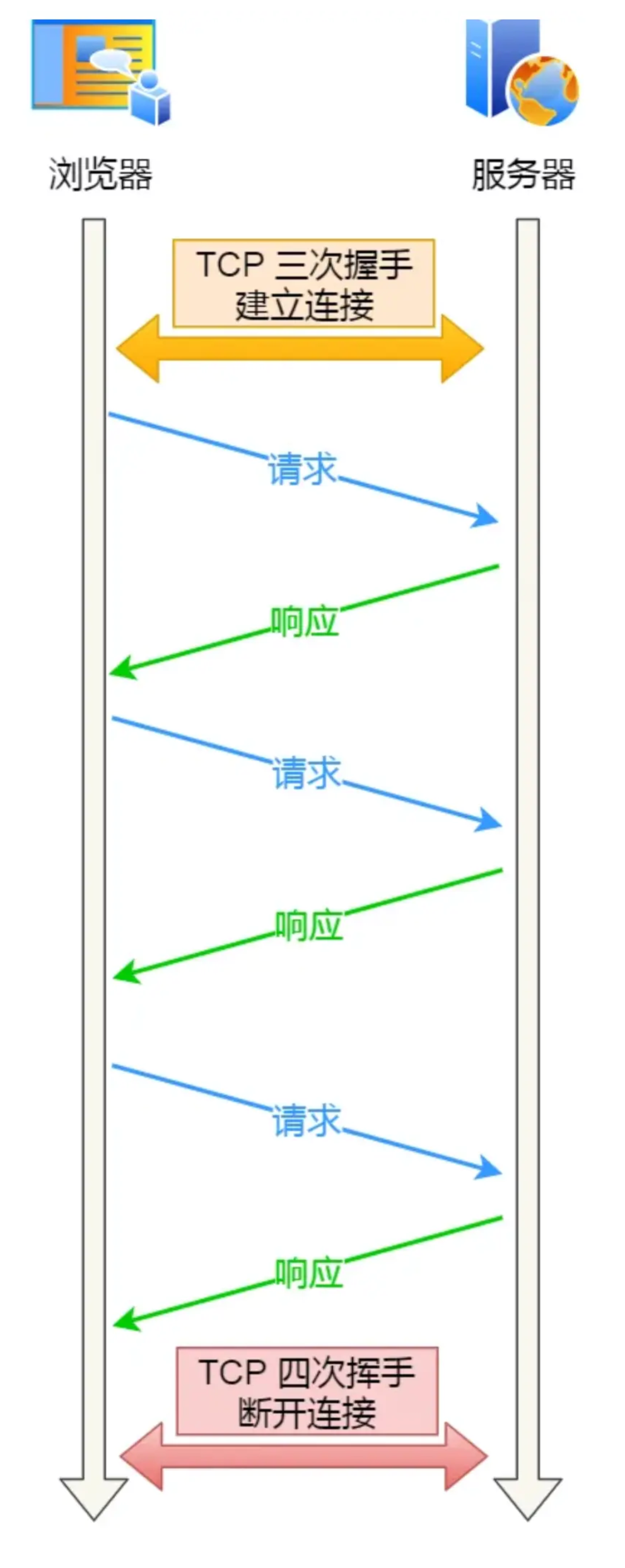- 一次握手,持续使用:连接建立后,这条通道一直保持,直到主动关闭。