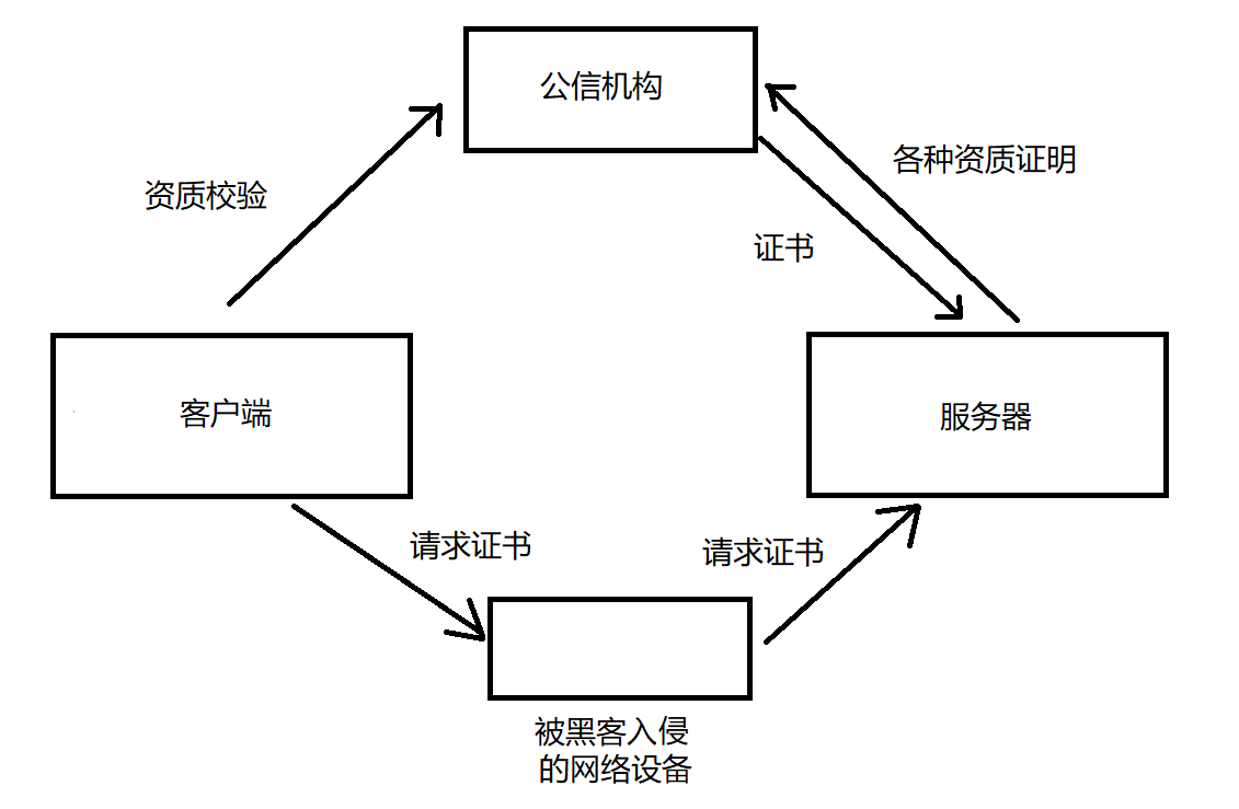 服务器在上线的时候就需要先去公信机构申请证书,服务器自己生成的公钥就放在证书中,客户端会请求一个证书,客户端会校验证书是否合理(证书上自身有的校验机制,或去公信机构进行求证),如果是黑客伪造的证书,就会校验失败。实际中,客户端会自身包含一些公信机构的信息(内置在操作系统中)可以直接本地进行认证。