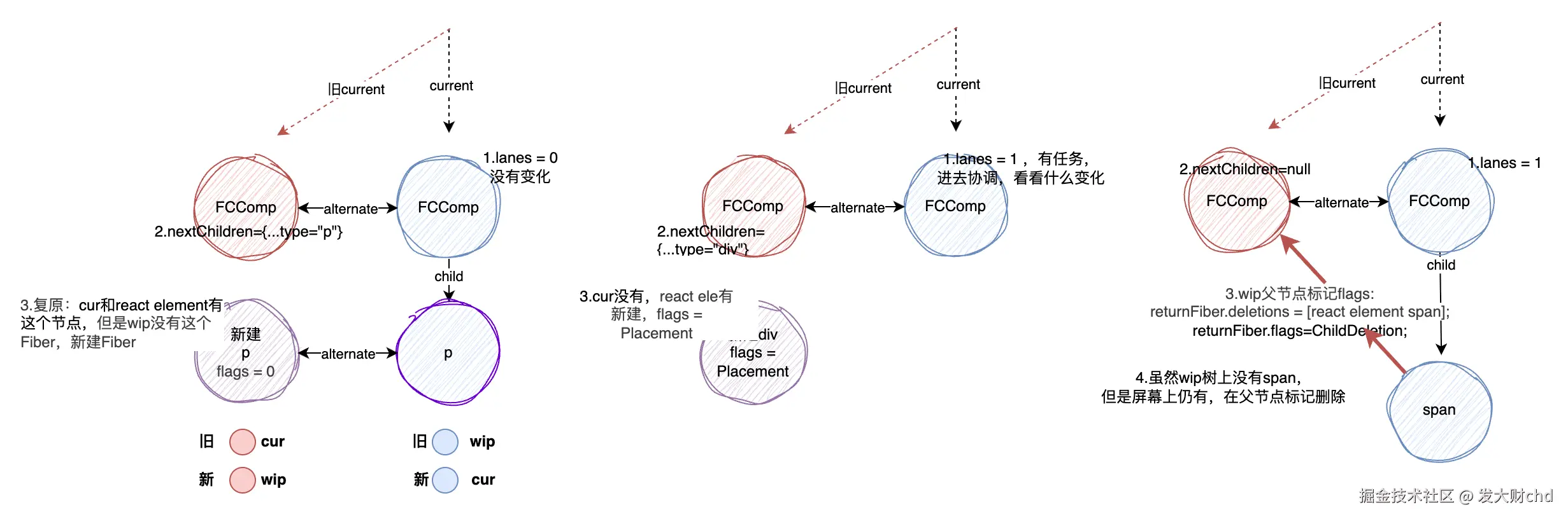 总之,它们都是先看有没有cur,再看有没有cur.alternate。复用可以复用的wip Fiber,否则新建新的wip Fiber。 区别是,"快速退出"的cur子树和需要构建的wip子树是一样的,所以不需要看有没有cur,只看有没有cur.alternate。