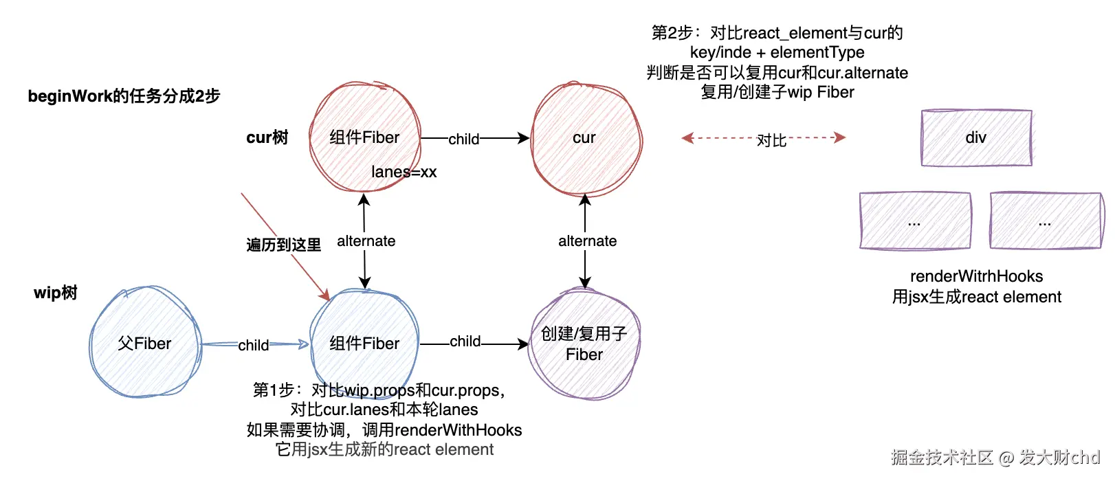 而,"协调"是指父组件发生了变化(props)或者组件自身状态发生变化(lanes),出现一个任务,例如等于lanes = 1(=SyncLane,同步任务),如果是元素类型,元素发生了变化(props),子树不能跳过协调---------需要"查询"与react element相同的cur 子节点。 & Diff cur子树与新wip子树。