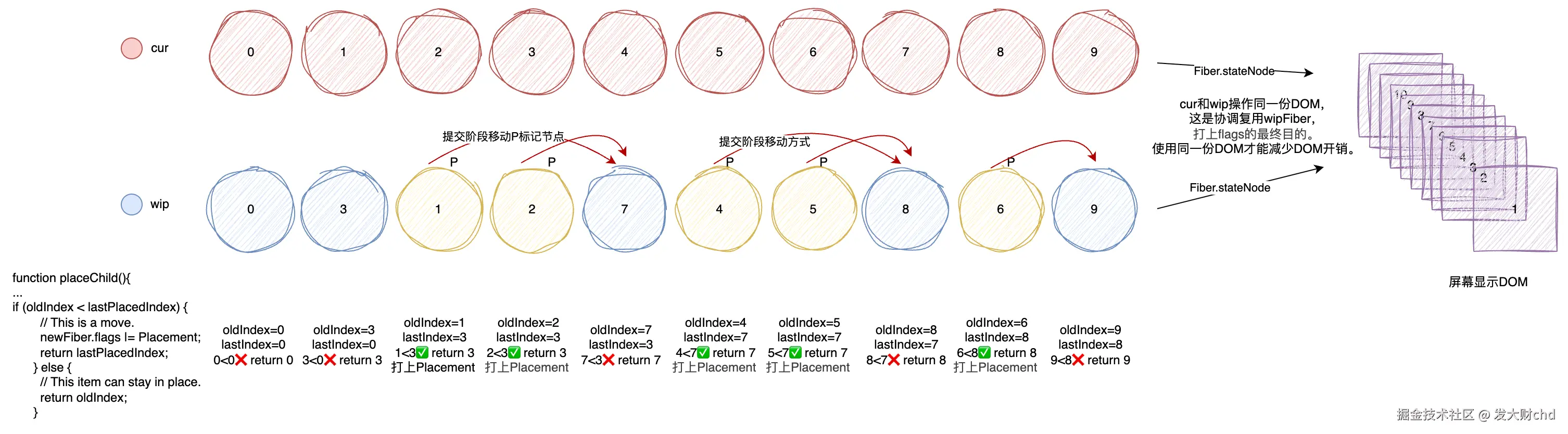 复用了 wipFiber,但是不知道 wipFiber 怎么移动到这个位置的。placeChild 这里对比 newFiber 和 oldFiber 的 index,打上标记,DOM 才知道 wipFiber 是怎么移动到这个位置的。