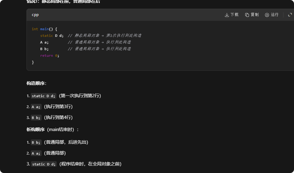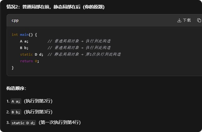 普通局部变量和普通静态局部变量,首先普通局部变量的构造顺序看main函数内部进行定义初始化的顺序,谁先定义初始化谁就先构造,相反,先构造的后析构,后构造的先析构;