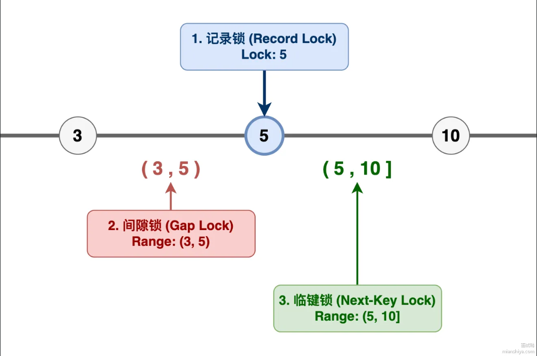 行锁又细分为三种:记录行锁锁住具体那一行,间隙锁锁住两条记录之间的空隙防止插入,临键锁是记录锁+间隙锁的组合。
