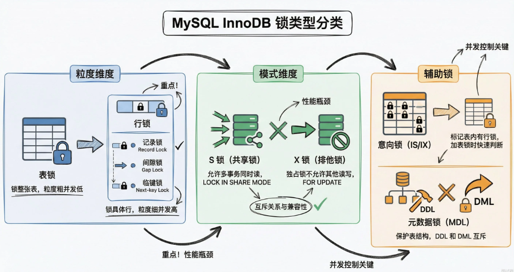 粒度上分 :表锁+行锁。表锁锁整张表,行锁只锁具体的行,粒度越细并发越高。