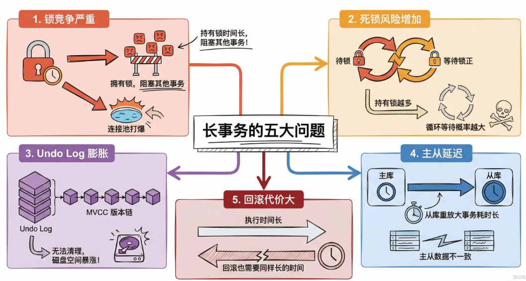 - 回滚代价大。长事务一旦报错回滚,之前长时间的成果都白费,并且回滚本身也耗时。