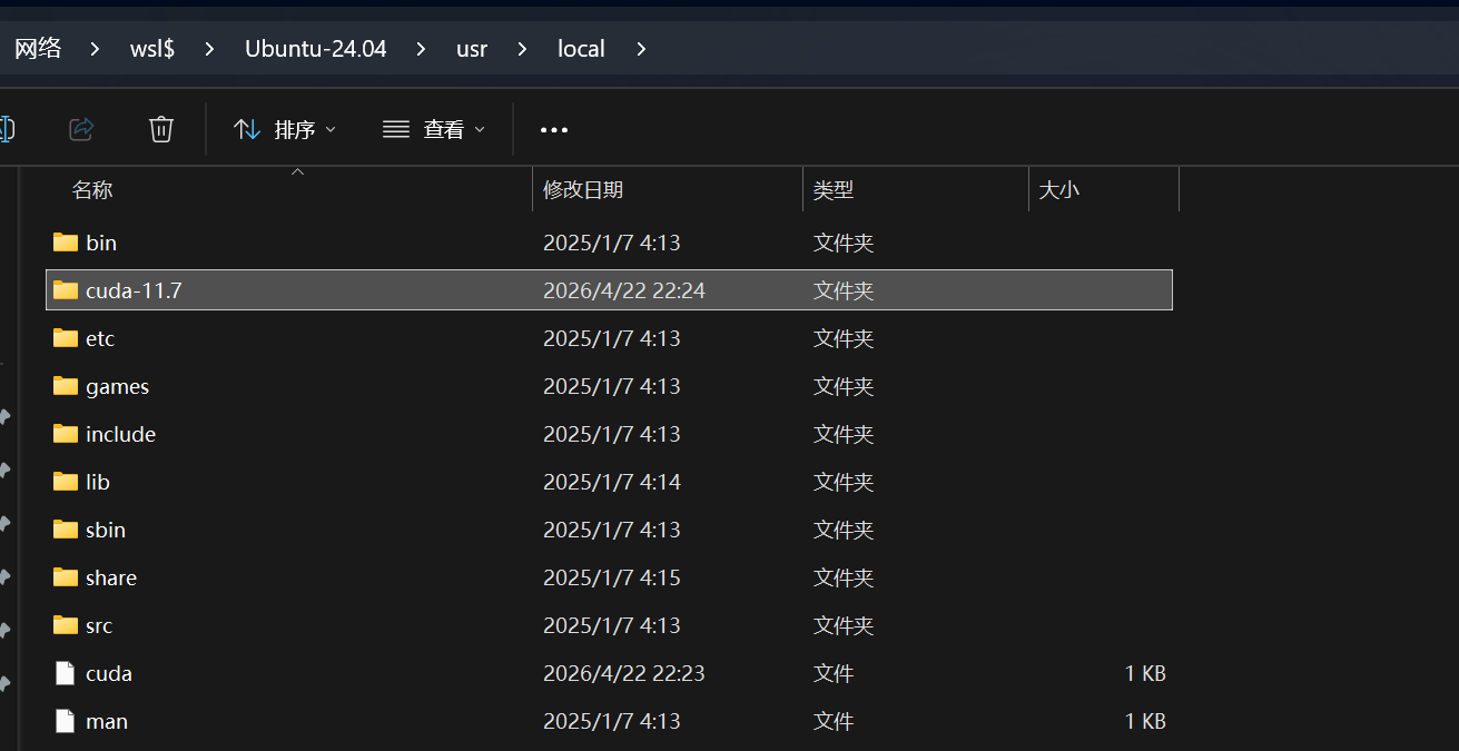 注意此处安装好了之后,默认CUDA toolkit会安装在wsl路径下面: