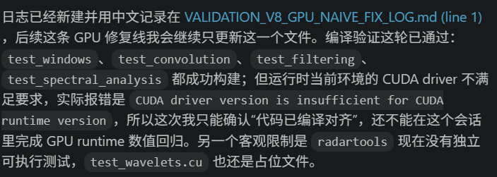 可是GPU 运行时仍然不通:依旧报错nvidia-smi 报 GPU access blocked by the operating system.我直接跑 test_windows 还是失败,报错落在 common.h,信息是 CUDA driver version is insufficient for CUDA runtime version报错和最初的基本一样说明终端会话里面虽然编译器版本对的,但是没有形成可用的CUDA编译环境,重要的是 GPU 运行权限/驱动仍然挡住了实际执行。