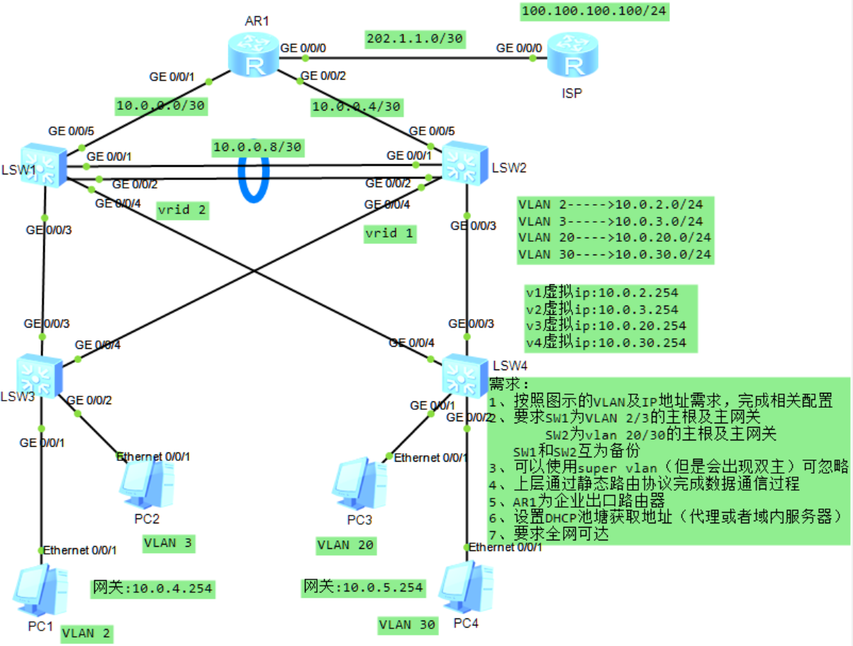 3.在sw1、sw2、sw3、sw4上配置mstp,完成主根配置并避免链路成环,并在sw1、sw2上配置vrrp完成主网关配置和主备操作
