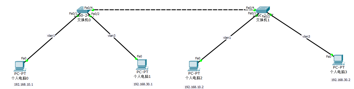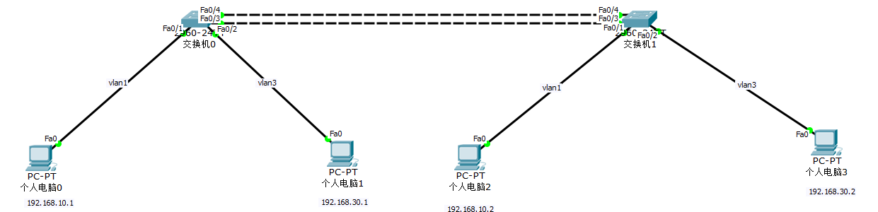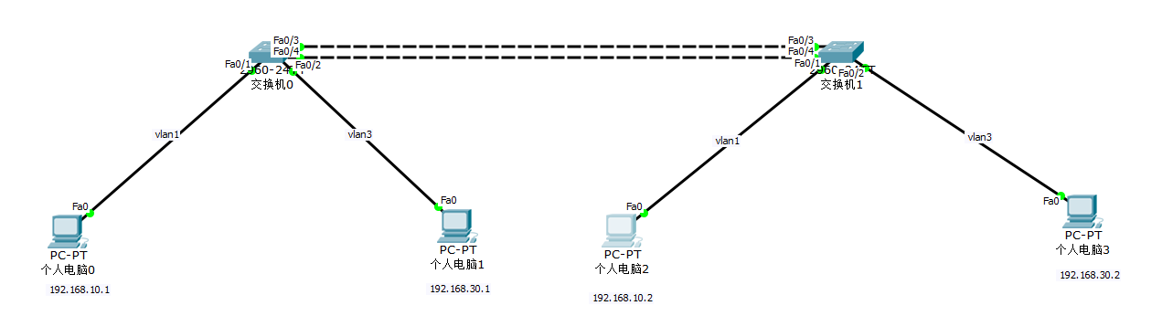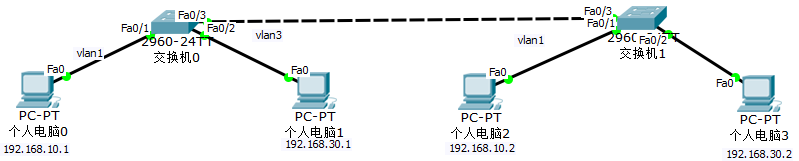 | IP 地址规划 | PC0:192.168.10.1/24(VLAN1)、PC2:192.168.10.2/24(VLAN1)PC1:192.168.30.1/24(VLAN3)、PC3:192.168.30.2/24(VLAN3) |
