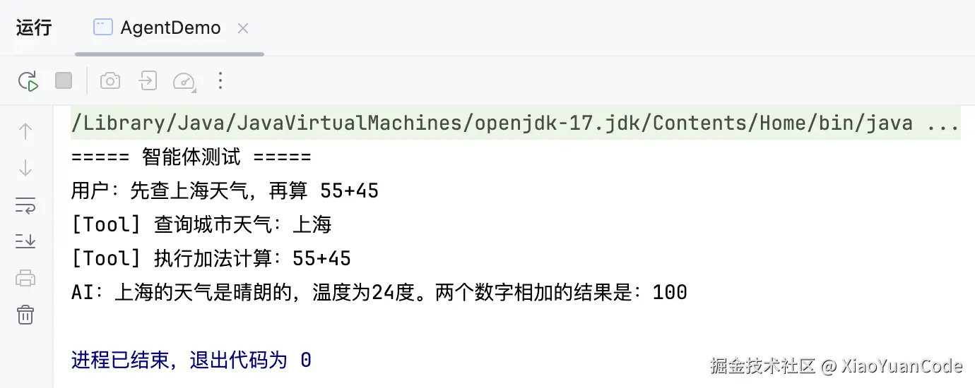 String response = agent.chat("先查上海天气,再算 55+45");