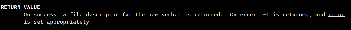 成功返回一个非负整数,就是 socket 文件描述符 fd,一般从3开始。失败则返回 -1,错误信息存在 errno 里。