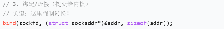 我们填充完 sockaddr_in 后,将其传给 bind 或 connect 时,必须强制类型转换为 struct sockaddr*。这也就是我们之前讨论的 "统一软件层" 和 "C 语言多态":系统调用接口只认通用的 struct sockaddr,但内核内部会通过读取结构体开头的 sa_family 字段,来识别这其实是一个 AF_INET 类型的网络地址,从而执行对应的网络协议栈逻辑。代码如下 :