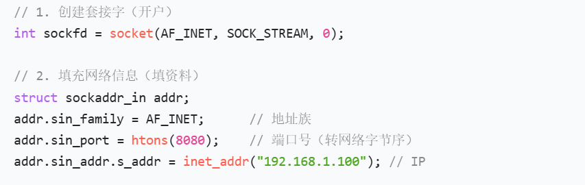 调用 socket() 系统调用后,内核为我们创建了一个通信端点,并返回了一个文件描述符 fd。此时,我们手里只有一个 "空的账户"(fd),还不知道要连接哪台主机、用哪个端口。接下来的关键步骤,就是填充通信信息。