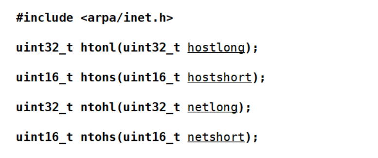 为使网络程序具有可移植性,使同样的 C 代码在大端和小端计算机上编译后都能正常运行,可以调用以下库函数做网络字节序和主机字节序的转换。