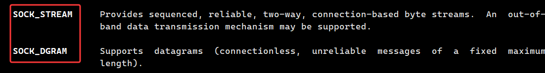 - SOCK_DGRAM:UDP 数据报套接字(无连接、不可靠)
