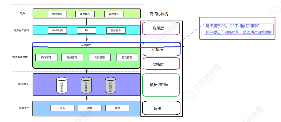 传输层、网络层完完全全都属于操作系统内核,传输层(TCP/UDP)、网络层(IP)、数据链路层都写在内核里,用户态代码不能直接碰内核里的 TCP、IP 协议栈。要实现网络通信,就必须通过系统调用,而用户要使用的就是 socket 那一套 bind/listen/connect/read/write 系统调用。用户程序只能通过这一层系统调用,才能调用内核传输层、网络层的协议栈能力。