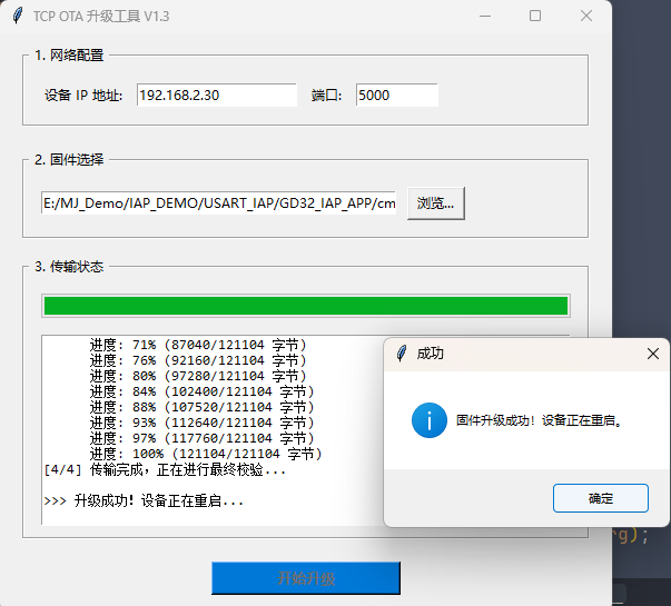 - 上位机:运行 TCP Client,选择固件文件,分片发送,并处理重传逻辑(通过 ACK 机制)。
