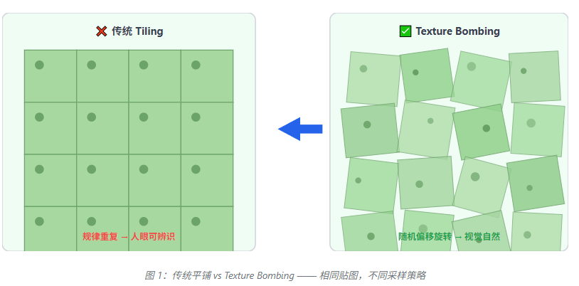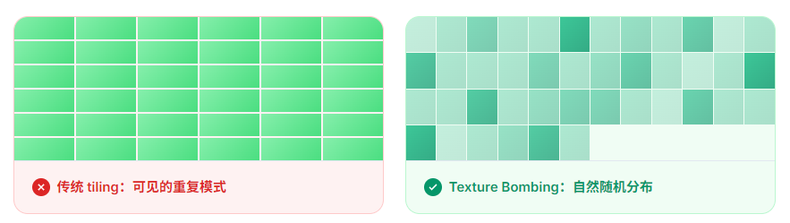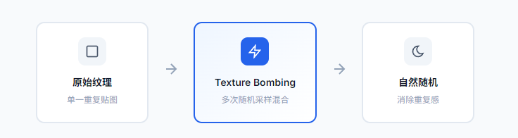 Texture Bombing 的本质不是使用更多贴图,而是对同一张贴图进行「空间扭曲」,让相邻像素看到不同的采样结果。