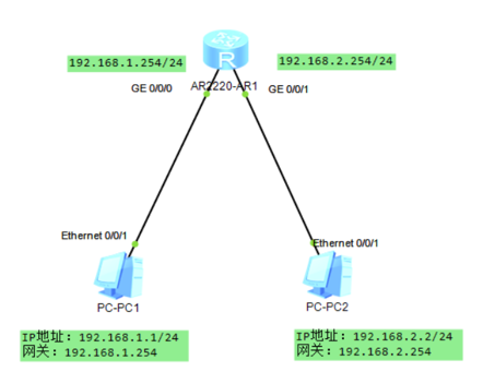[Huawei-GigabitEthernet0/0/1]ip address 192.168.2.254 255.255.255.0 #0/0/0接口配置IP地址