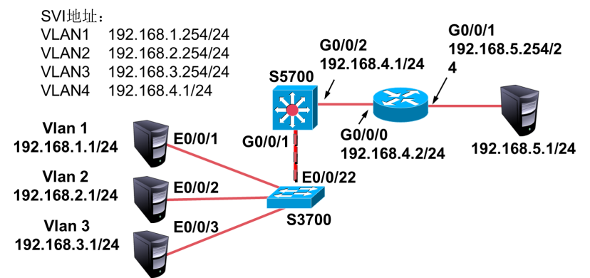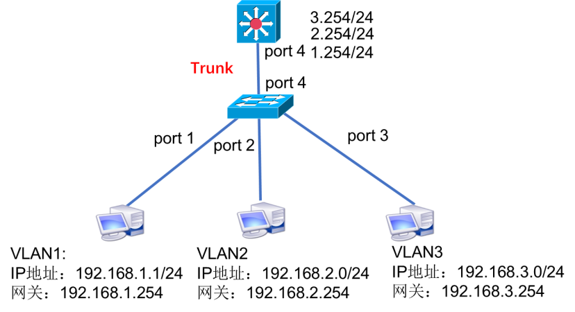 - 二层交换机和三层交换机连接的接口需要放行所有vlan通过