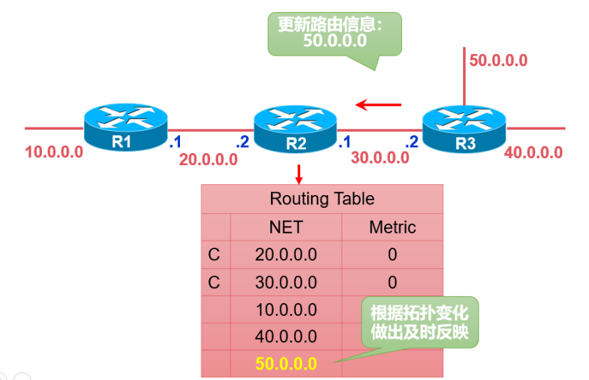 - 工作流程:接口配IP生成直连路由→路由器间自动交互路由信息→根据网络拓扑变化实时更新路由表