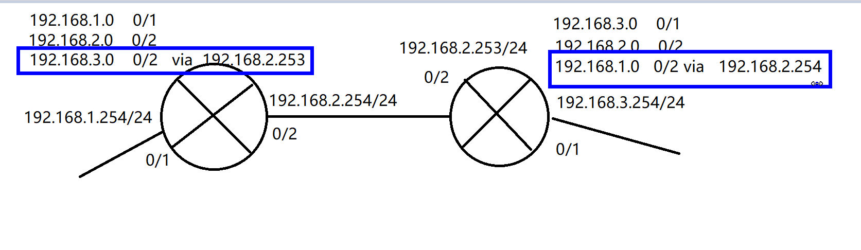 本图中,对于左侧路由来说,1.0和2.0是它的直连路由;对于右侧路由来说,2.0和3.0是它的直连路由;蓝框中是它们的静态路由。