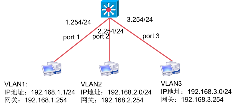 VLAN1主机(192.168.1.1)发现目标IP(192.168.2.x)与自己不同网段,将数据包发给默认网关(192.168.1.254,即三层交换机的Vlanif1),帧目的MAC为Vlanif1的MAC地址。