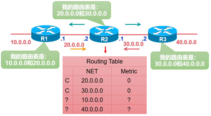 如例图,每个路由配置了不同的IP地址,且互相联通,配置了动态路由之后,他们会自动学习路由条目,最后所有路由器会拥有全网完整网段条目(但各自路由表的下一跳、出接口不同,不会完全一致)