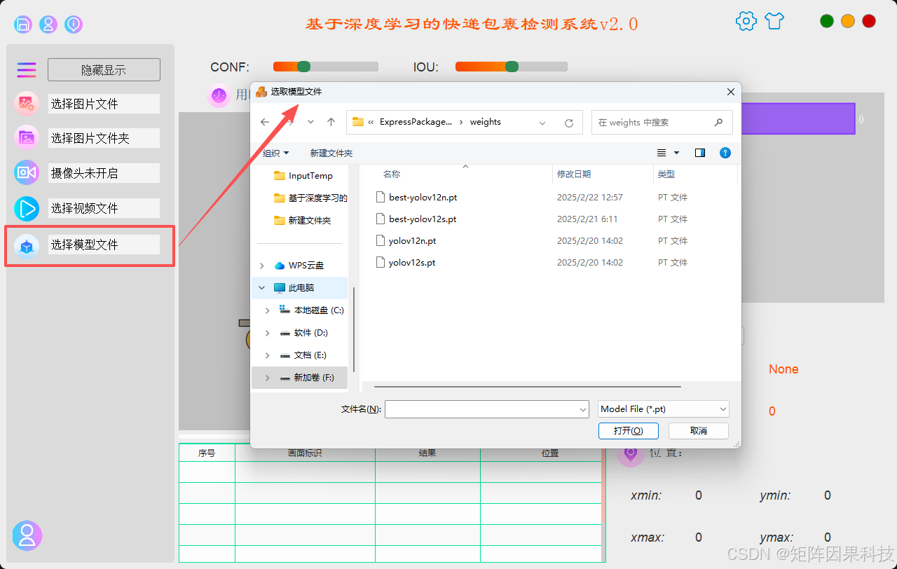模型选择 :系统在主界面提供模型下拉框或权重管理面板,支持从预置的 YOLO 系列模型中快速切换,也允许用户导入自训练权重文件。切换时控制层先完成权重路径校验与模型结构匹配检查,再由处理层在独立推理线程中完成加载与一次前向预热,避免首次推理造成的明显时延抖动;切换完成后,界面端同步更新模型元信息(参数量、输入尺寸、推理后端等)并将选择写入用户配置,确保下次启动可恢复到上一次使用状态。该设计的核心是把"模型切换"做成稳定的状态迁移过程,减少因误操作引发的崩溃与资源泄漏风险。