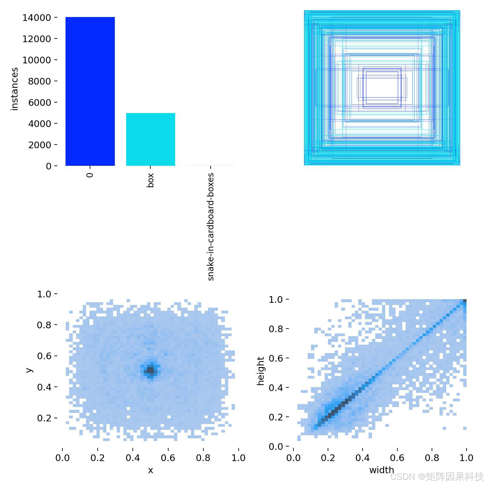 从标签统计图可以看出,数据集的目标中心分布在图像中部具有更高密度,这与拍摄/截帧时"主体居中"的采集习惯一致;而宽高二维分布呈现明显的尺度跨度与相关性,说明同一类别在不同距离和不同摆放方式下具有显著外观尺度变化。类别实例数存在一定不均衡:以"包裹(Class 0)"与"纸箱(Class 1)"为主,"塑料袋(Class 2)"相对稀疏,这种长尾分布会在训练中放大误检与漏检的差异,因而更依赖合理的数据增强、采样策略或损失加权来维持小样本类别的召回率。工程实现中,为避免类别名中出现数字字符串带来的歧义,界面层通过 Chinese_name = {"0":"包裹","box":"纸箱","snake-in-cardboard-boxes":"塑料袋"} 将原始类别名映射为中文显示,从而保证 UI 统计与日志输出的可读性与一致性。