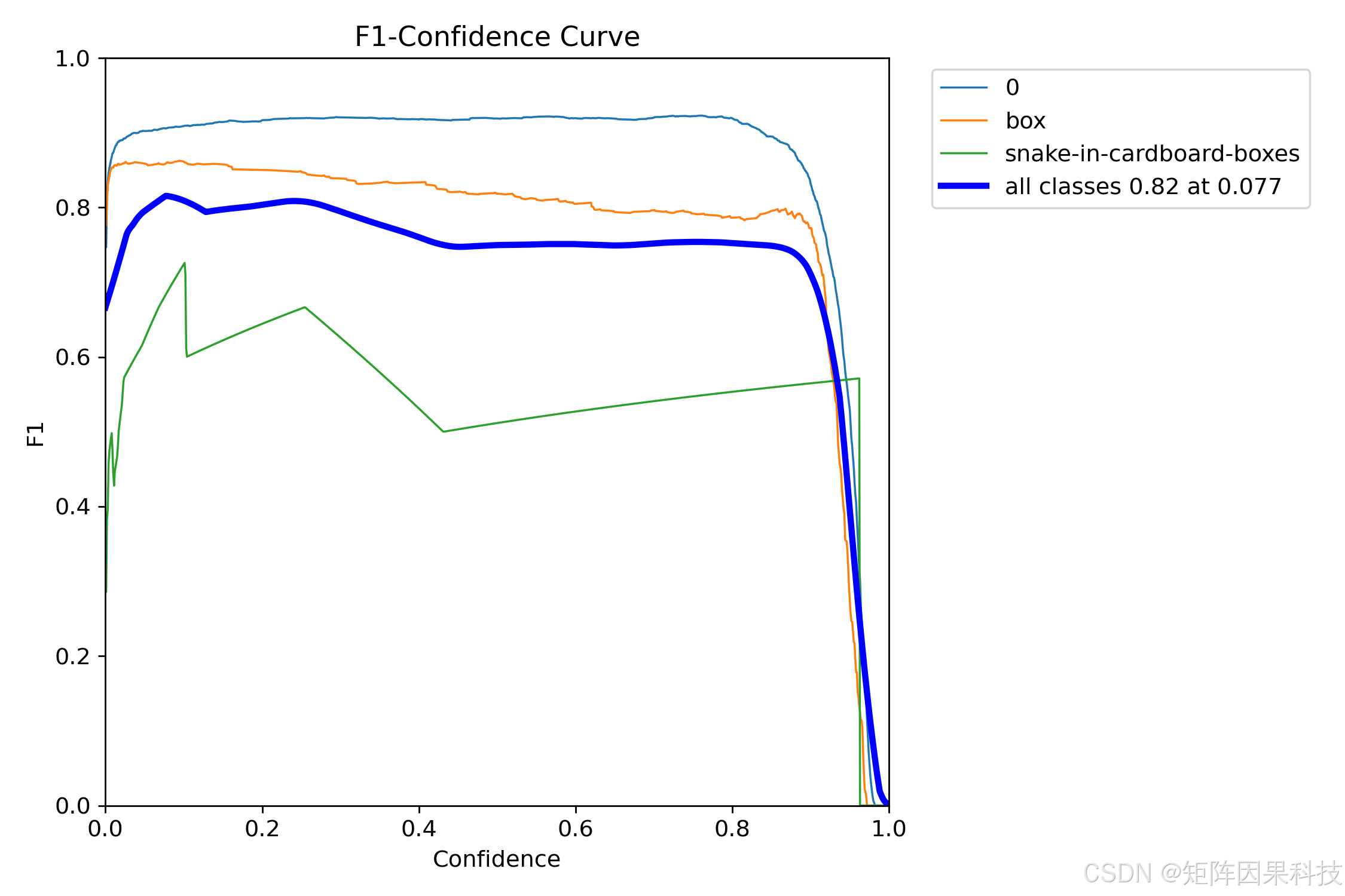 置信度阈值的选取可通过 F1-Confidence 曲线确定:图中全类最优点约出现在 conf = 0.077 ,对应 F 1 ≈ 0.82 F_1\approx0.82 F1≈0.82 。这一结果意味着在当前训练分布下,若系统更重视"尽量不漏检"(例如用于后端复核),可将 conf 设在 0.07--0.10 的区间以提高 recall;若更重视"计数稳定、少误报"(例如直接驱动分拣逻辑),应将 conf 上调并配合更严格的 IoU/NMS 策略。