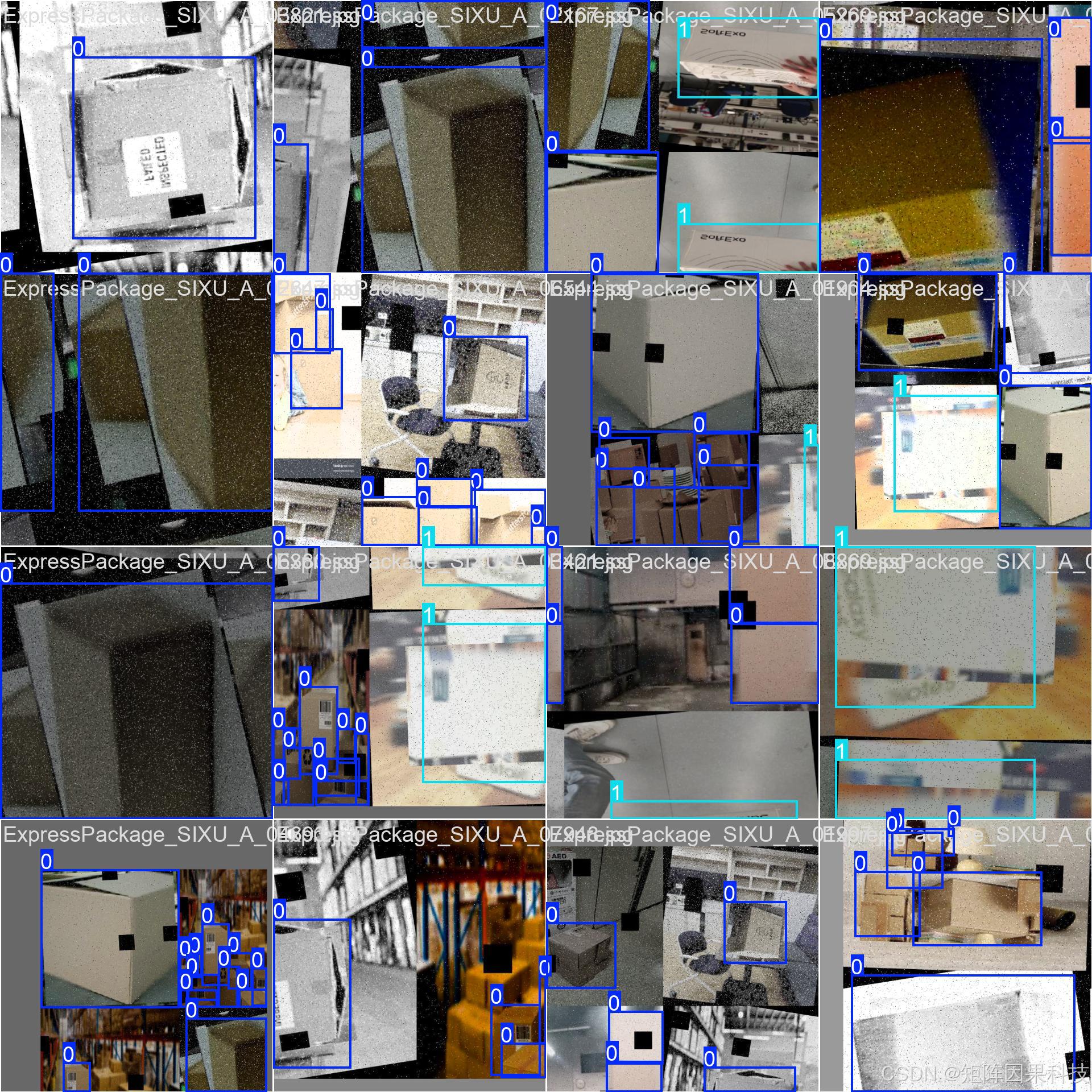 本研究面向物流分拣与仓储盘点场景,构建了一个以"快递包裹/纸箱/塑料袋"为核心目标的检测数据集。数据集中每张图像均采用矩形框进行目标级标注,标注以 YOLO 规范的归一化坐标形式保存(每行对应一个目标,包含类别编号与 ( x c , y c , w , h ) (x_c,y_c,w,h) (xc,yc,w,h) 四元组),便于直接接入 Ultralytics 等主流训练框架进行端到端训练与部署。在数据构建流程上,老思采用"样本采集---人工筛选---统一命名与清洗---标注---一致性复核---划分"的方式控制噪声:一方面尽量覆盖室内/仓库/传送带等不同背景与光照,另一方面通过引入遮挡、反光、堆叠、尺度变化等典型困难样本,使数据分布更贴近真实分拣线的视觉条件。为提升训练稳定性,图像在加载阶段按模型输入尺寸进行等比例缩放与 letterbox 填充,并在训练阶段配合 Mosaic、随机缩放/裁剪、颜色扰动与随机遮挡等增强手段,以减弱域偏移和遮挡导致的漏检风险(从训练 batch 的可视化结果中也可观察到典型的拼接与遮挡增强痕迹)。