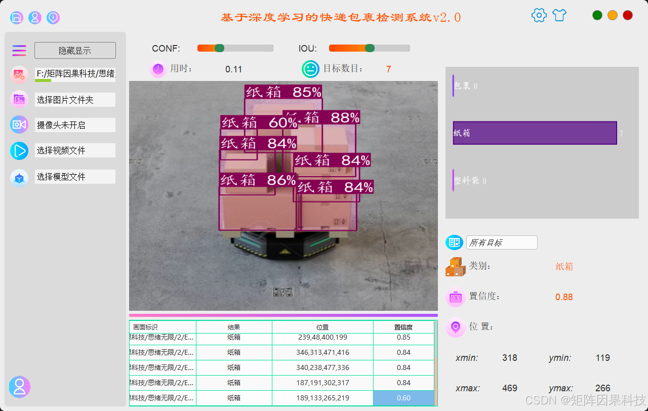 摘要:面向物流分拣与仓储盘点场景,快递包裹的自动检测与统计是实现作业数字化与降低人工成本的关键环节。本文围绕基于深度学习的快递包裹检测系统展开,采用以 YOLO 系列为核心的目标检测框架完成包裹目标的定位与类别识别,并结合数据清洗、标注规范与增强策略提升对复杂背景、遮挡堆叠、尺度变化与光照扰动的鲁棒性。系统侧重工程化落地,前端以 PySide6 构建交互界面,支持图片/视频/摄像头多源输入、置信度与 IoU 阈值可调、检测结果可视化与批量统计;后端提供结果持久化存储与导出能力,便于后续追溯分析与业务对接。实验部分对不同轻量化检测模型进行对比评估,并从精度、速度与资源占用维度分析其在实际部署条件下的适配性,为物流场景下的包裹检测系统设计与实现提供可复用的技术参考。