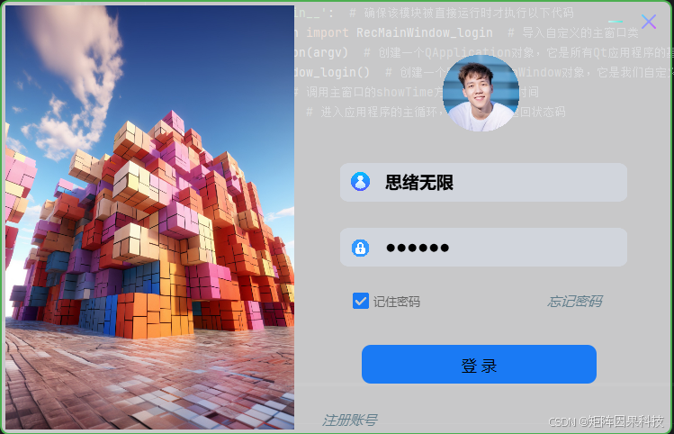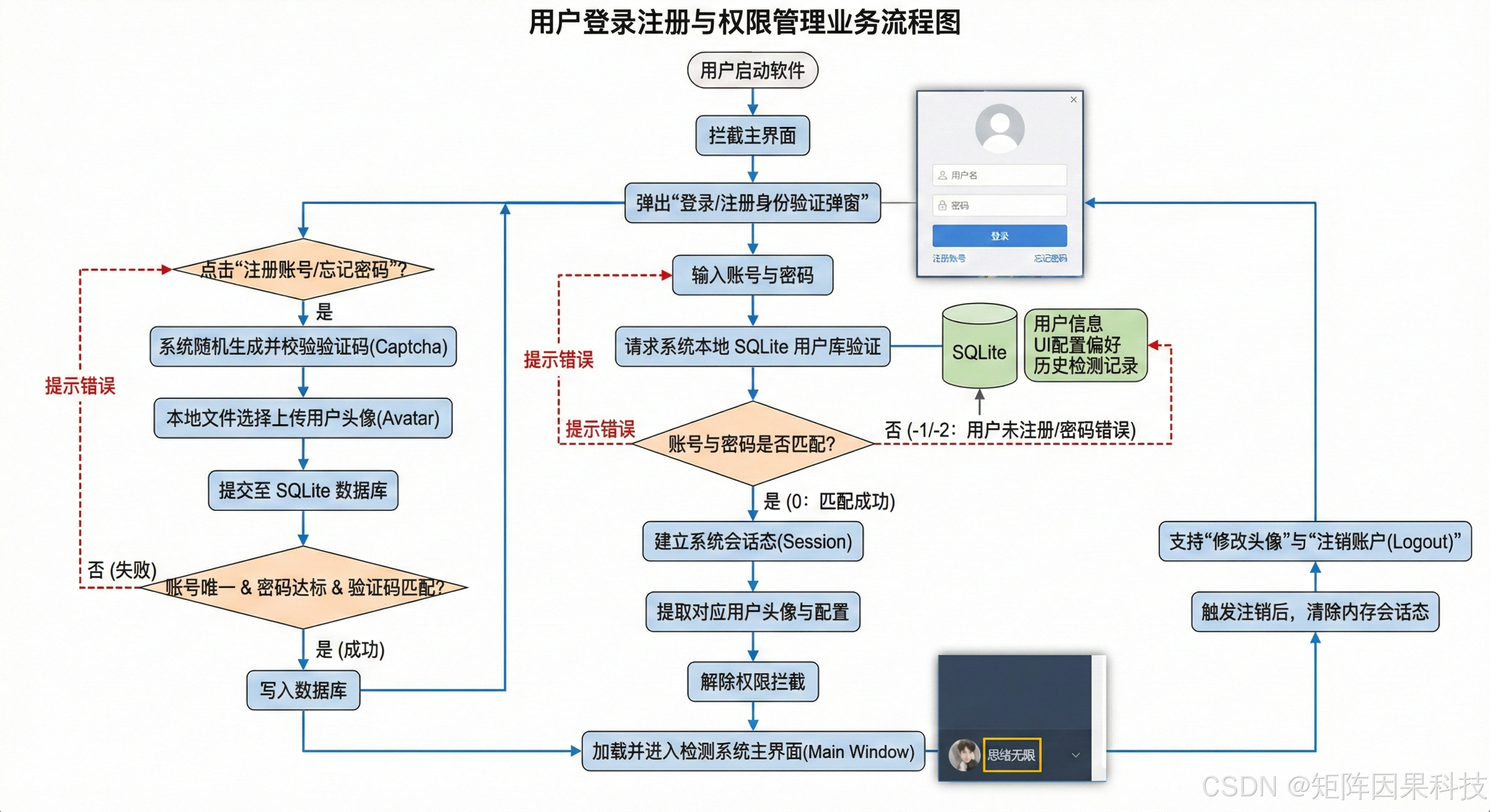 登录注册 :系统启动后首先进入登录界面,用户可在同一入口完成"登录---注册---找回/修改"的基础闭环。登录阶段由界面层收集账号与密码信息,控制层触发数据库查询校验,通过后加载该用户的个性化配置与历史检测记录,并将会话态写入内存以便后续模块调用;注册阶段则对账号唯一性与密码强度进行前置检查,随后将用户信息写入 SQLite,并支持上传头像作为界面个性化标识。为避免界面卡顿,登录校验与数据库读写均以信号槽方式与主线程解耦,界面端仅承担状态反馈与错误提示,从而保证交互流畅与可维护性。